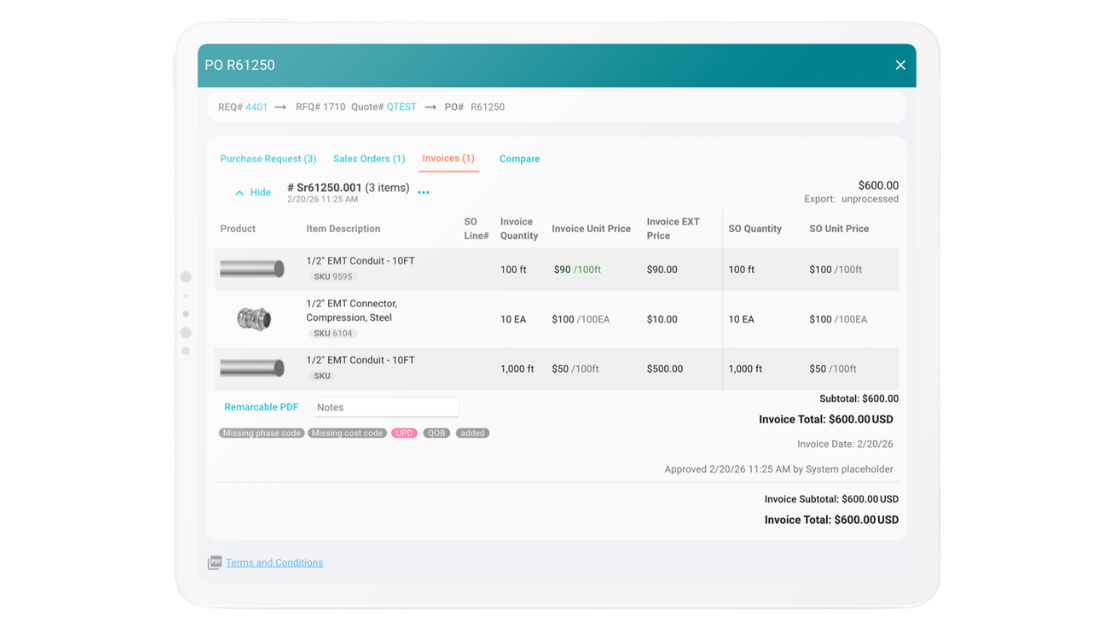 AI Invoice and Quote Processing reads any supplier document in any format and pulls out the line items, quantities, prices, taxes, and totals. It matches the data back to the original PO and flags the things that do not line up. It works on documents from suppliers the system has never seen before, and it gets sharper the more you use it. There are no templates to build and no rules to configure. You forward the document and the Remarcable Intelligence engine handles the rest.