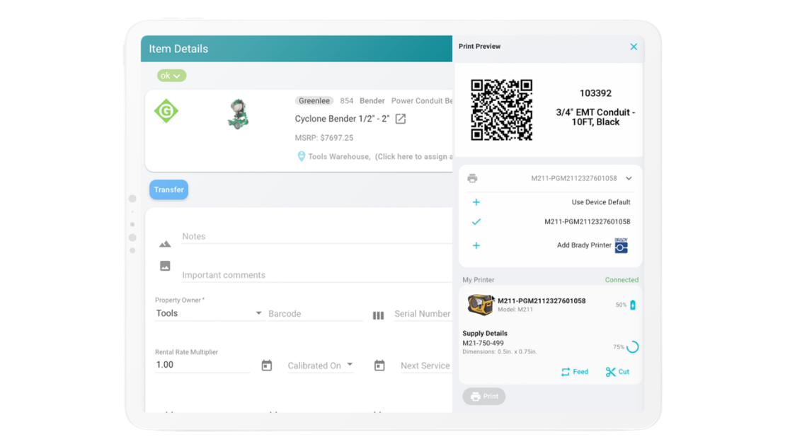 Brady is the label printer most contractors already use for panel schedules, wire markers, arc flash labels, and asset tags. With the Brady integration, you can print Remarcable labels directly from your Brady printer. Every tool gets a scannable tag that ties back to its record in Remarcable.